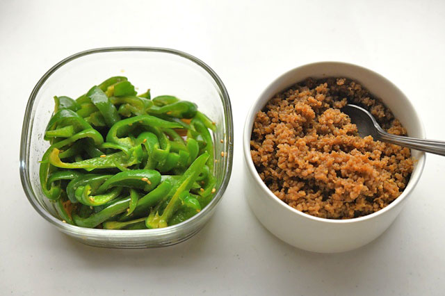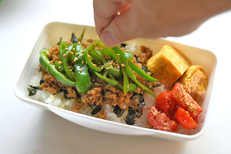 弁当日記#37 ピーマンとそぼろ丼弁当 #作り置きが心強い!お弁当シリーズ 常備菜である”鶏そぼろ”を活用した丼もの弁当です。ピーマンがお好きでしたらぜひ! お気に入り登録 11件 ツイート お気に入りを登録しました! 「お気に入り」を解除しますか? お気に入りを解除すると、「メモ」に追加した内容は消えてしまいます。 問題なければ、下記「解除する」ボタンをクリックしてください。 解除する 「お気に入り」の登録について 白ごはん.comに会員登録いただくと、お気に入りレシピを保存できます。 保存したレシピには「メモ」を追加できますので、自己流のアレンジ内容も残すことが可能です。 また、保存した内容はログインすることでPCやスマートフォンなどでもご確認いただけます。 会員登録(無料) ログイン スポンサーリンク 鶏そぼろなどの具は前日準備で! 【鶏そぼろの準備!】「鶏そぼろ」は冷蔵4~5日保存できて、冷凍も可能。余裕のあるときに、200~300gくらいをまとめて作っておくと、何かと便利です。今回も冷蔵ストックを活用しました! 【ピーマンはナムルに!】ピーマンはレンジ加熱でナムルにすると鶏そぼろとよく合います。これは前日の夜に作っておいてもOKですし、当日の朝に余裕があれば作る流れでもどちらでも大丈夫です。 1 当日は盛り付けはこんな感じ! 【卵焼きとミニトマトごま和え】鶏そぼろ丼がメインなので、彩りのよい副菜を2つ当日の朝に作りました。卵焼きとミニトマトのごま酢和えです。甘い系とさっぱり系! 【盛り付け①】ごはんを容器に詰めて冷まし、その上にちぎった海苔、鶏そぼろ、ピーマンのナムルの順に盛り付けます。鶏そぼろが出来立てでない(前日に作ったなどでない)場合は、盛り付ける前にレンジで温めて、それを冷ましたものを盛り付けるとよいです。 【盛り付け②】奥に卵焼き、手前にミニトマトのおかずを盛り付けました(汁気が気になるようならミニトマトはカップに入れてもOK)。仕上げに丼のほうに白いりごまをちらして出来上がりです! 1 ▼「弁当日記#37 ピーマンとそぼろ丼弁当」レシピ一覧▼ 鶏そぼろ丼(ピーマンナムルのっけ) #どんぶりや混ぜご飯 鶏そぼろ #基本のおかず、#肉のおかず、#まな板&包丁いらず、#冷凍保存可能、#冷蔵で3~4日保存可能、#ごはんのお供 卵焼き #基本のおかず、#卵のおかず ミニトマトのごま酢和え #野菜のおかず、#10分以内のかんたん副菜 もっと見る ホーム きょう何つくる? ピーマンと鶏そぼろ丼弁当|白ごはん.comの作り置きが心強い!お弁当シリーズ