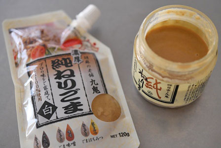 ごまだれには、市販の白ねりごまを使います。ねりごまは瓶詰やチューブ状のパックなど包装形態がさまざまですが、どれも油とごまの固形物が分離しやすいので、使う前に必ず均一に混ぜて(又はもみ込んで)ください。