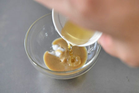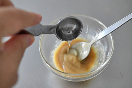 スプーンで全体をよく混ぜてから、最後にBの水小さじ1/2を目安に、ごまだれの粘度調整を行います。
