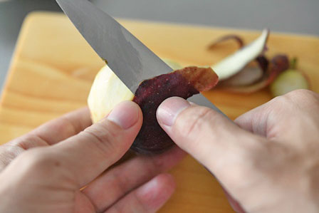 いちじくの上の部分を切り落とし、皮を薄くむきます。それを縦に4等分に切ります。