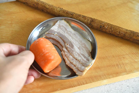 まず、用意するものはごぼう、にんじん、ベーコンです。