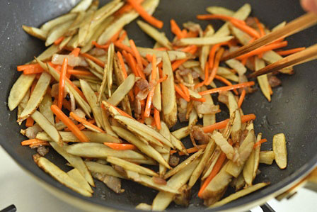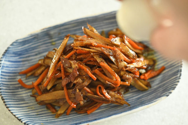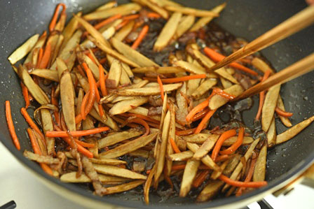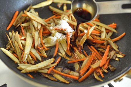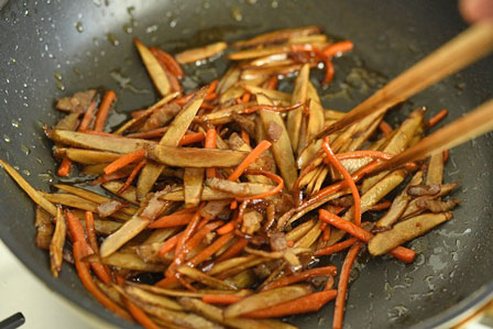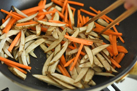※ごぼうは最後に切るようにして、(水にさらさずに)時間を置かずに、炒め始めるとよいです(時間を置くときは、水にさらしましょう)