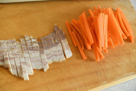 にんじんは皮をむいて棒状に、ベーコンは6~7㎜幅に切ります。