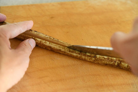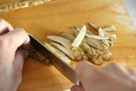 ごぼうは皮を軽くこそげ、縦半分に切って、2㎜幅の斜め切りにします。