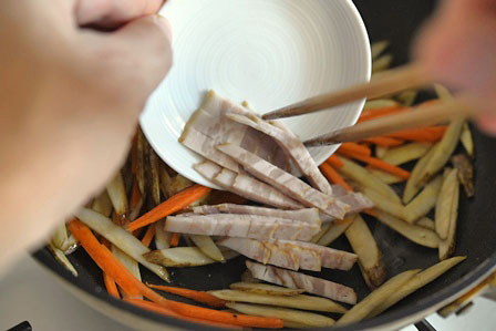 油が熱くなってきたら、ごぼうとにんじんを入れて【2分】炒めます。続けてベーコンを入れます。