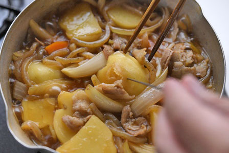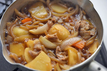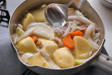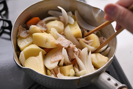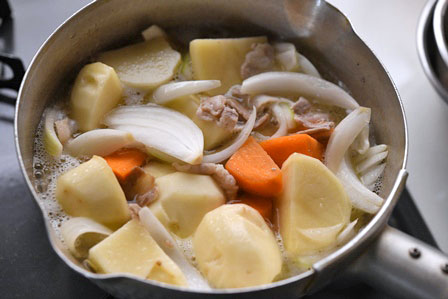 じゃが芋に火が通った段階で落し蓋を外し、ここから、さらに7〜8分ほど煮汁を煮詰めて味を濃くしていきます。