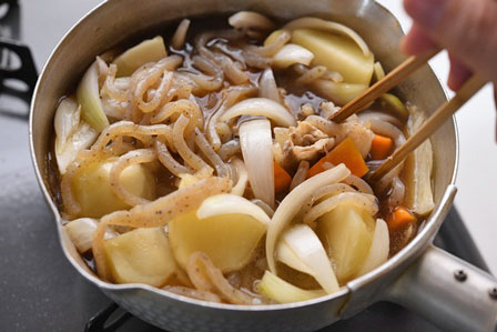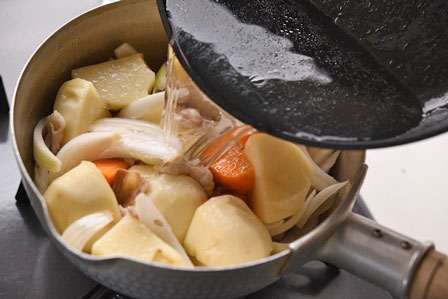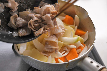 - その工程の場合は、豚肉を炒めたフライパンに残った旨味や脂も、水と一緒に鍋に戻すとよいです。
