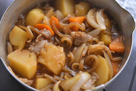 うちでよく作っている豚肉入りの肉じゃがのレシピの紹介です。だし汁なしで、【豚バラ肉、じゃが芋、玉ねぎ、にんじん、こんにゃく】を具に作ります。