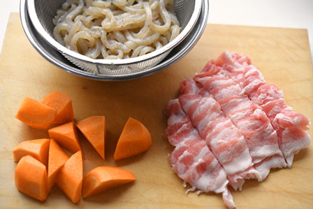 突きこんにゃくは水洗いして、しっかりと水気を切っておきます。にんじんは乱切りに、豚肉は2〜3cm幅に切ります。