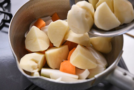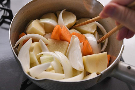 じゃが芋は皮をむいて、3~4㎝角ほどの大きさに切り(小さいものは4等分、大きいものは5〜6等分)、玉ねぎは半分に切ってから6等分のくし切りにします。※じゃが芋は、煮込んで味がなじみやすいので“男爵芋”がおすすめです。