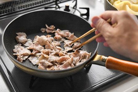 - 今回は鍋で野菜を炒め、別のフライパンで豚肉を炒め、というふうに分けて作りました。アルミやステンレスの片手鍋は豚肉がけっこうくっつきやすいので、そのようにしています(豚肉と野菜を炒め合わせることも油に香りが移って美味しく仕上がります!)