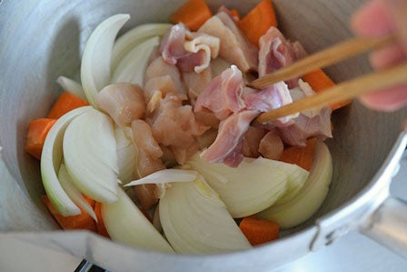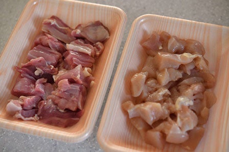 - 上の写真では、鶏もも肉と鶏むね肉を半々にして作りました。どちらか一種でもよいですし、半々にしても美味しいです。
