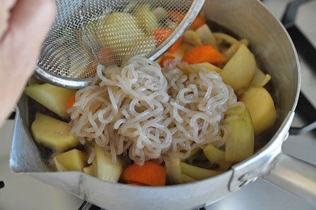 - 糸こんにゃくは長さを半分にして熱湯でさっとゆでる