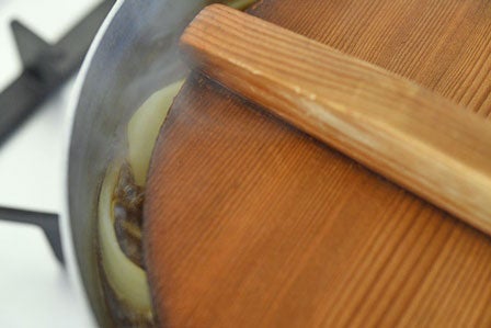※落し蓋がない場合は、アルミホイルやキッチンペーパーなどを切り取って代用してください。煮汁の上に蓋があることで、少なめの煮汁でも野菜全体に火を通すことができます。