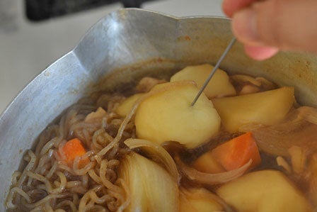 10分たったら、串を大きめのじゃが芋に刺して火通りを確認します。すっと刺さったらOKです(硬いようなら弱火で1~2分追加で加熱してください)。