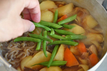※いんげんや絹さやの火の入れ方は、「基本の肉じゃが」のように、最後に煮汁に浸して火を通してもOKです。いんげんはじっくり煮ても美味しいので、レシピではしっかりめに火を通しています。