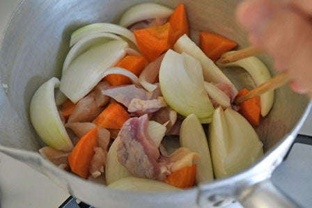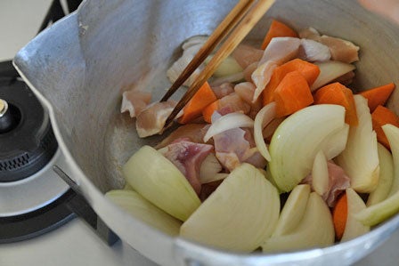 - 油を熱して玉ねぎ,人参,鶏肉を軽く炒める(1分)