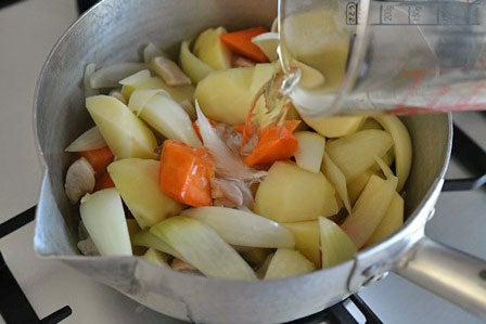 鶏肉以外の具材は、【じゃが芋、玉ねぎ、にんじん、糸こんにゃく、いんげん】を用意し、薄めのだし汁も使用します。