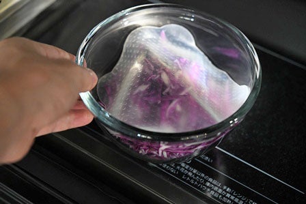 紫キャベツは5~6㎜幅に刻みます。切ったものは耐熱ボウルに入れます。