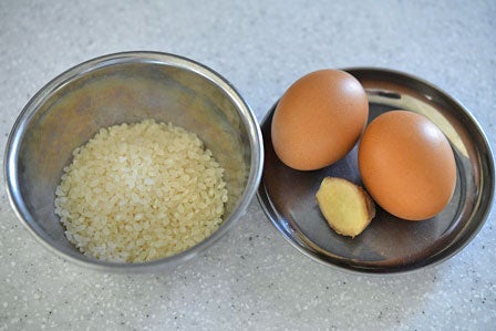 卵がゆの米と水の割合は米1/2合に対して、水950ml、卵2個です。ここに生姜少々を合わせます。