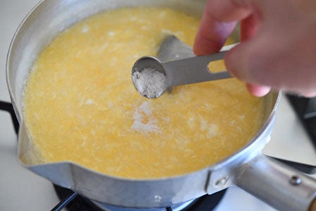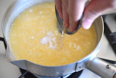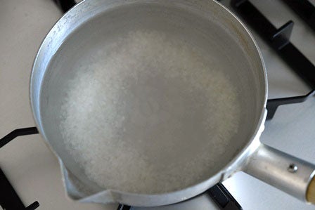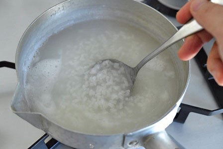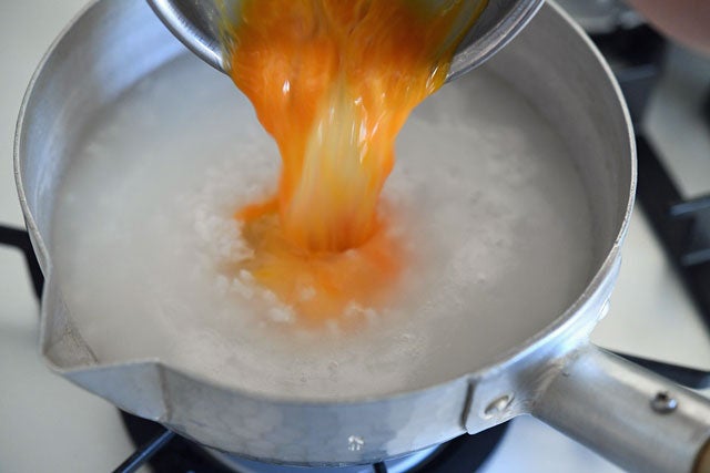 ※「基本のおかゆ」では、弱火で蓋をして加熱していますが、卵がゆでは、蓋なし、火がもう少し強めでぐつぐつ炊いていきます!
