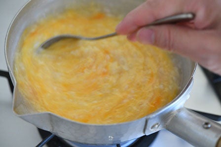- 加熱しながら溶いた卵を入れたり、卵をしっかりと溶いて少しずつ加えたりすると、卵の固まり方が変わる(よりおおきな塊ができるようになる)ので、火を止めて、軽く溶いた卵を一気に入れる、そしてすぐに混ぜるやり方でやってみてください。