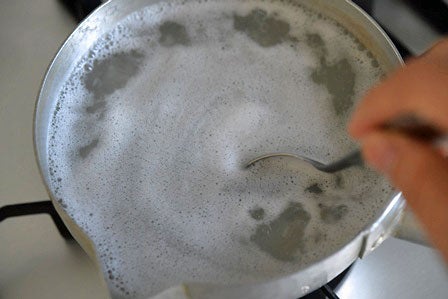 鍋を中火にかけます。軽く沸いてきたら、おたまなどで鍋底を混ぜます。