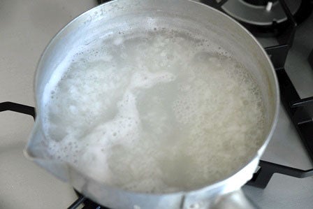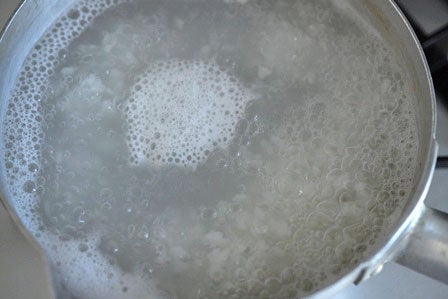 - 沸いたら一度混ぜ、少し火を弱めて炊く(15分)