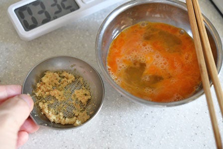 加熱している間に皮ごと生姜をすりおろし、卵2個分を軽く箸で溶いておきます(卵は溶きすぎない状態にしておきます。10回くらい箸で溶くだけでOK)。