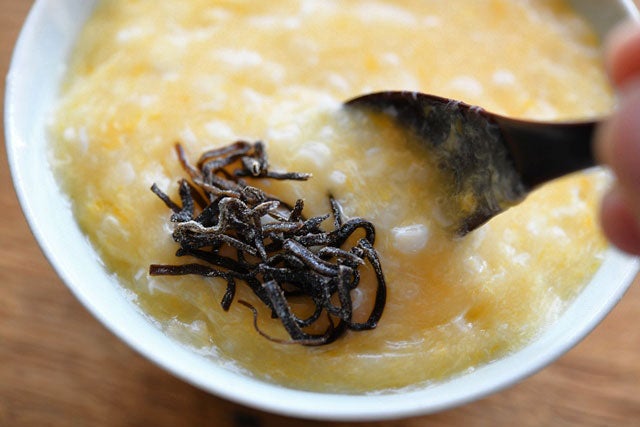 卵の味わいと生姜の風味がやさしく、そのまま食べてほんとに美味しいおかゆです。好みで、塩昆布をのせても美味しいです。