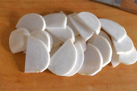 かぶは茎を切り落としてさっと洗い、皮ごと3~4㎜幅ほどのいちょう切りにします。