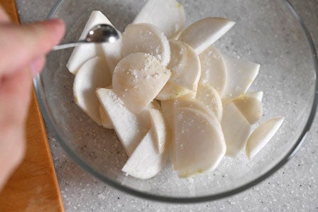 切ったかぶをボウルに移し、塩小さじ1/5を全体にまぶして【5分】おきます。