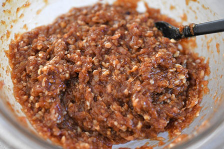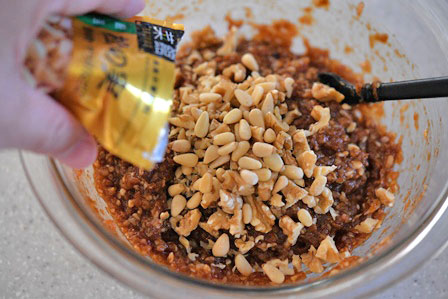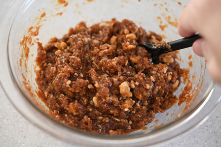 - 鶏ひき肉を混ぜ、くるみと松の実を合わせる