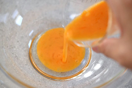 はじめに、小さい容器に卵を割り入れてよく溶きます。松風のタネを混ぜるボウルに、卵1/2個分を加えます(残りは他の料理に使ってください)