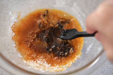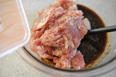 調理べらなどで味噌のダマがないように先に調味料だけをよく混ぜ、後から鶏ひき肉を加えます。ひき肉と調味料をさらによく混ぜます。