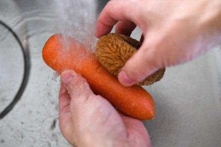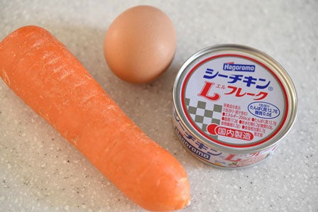 用意するものは、【にんじん・卵・ツナ缶】。にんじんは皮ごと調理してOKなので、流水で洗っておきます。