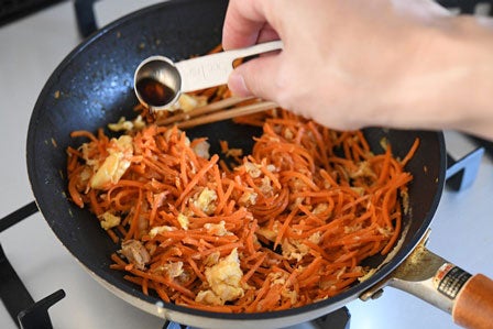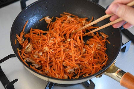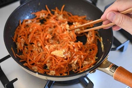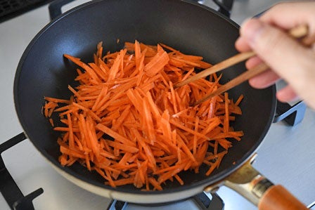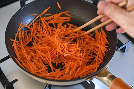 • くっつきづらいテフロンのフライパンなどなら、にんじんのせん切りをボウルではなくフライパンに直に投入して、ごま油を入れて炒めてもOKです。