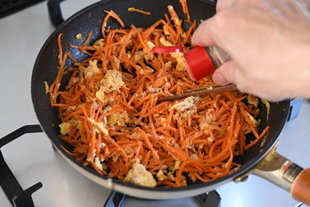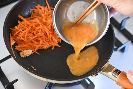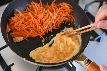 ツナ缶を入れる前に、手前を空けて卵を同じように加熱し、にんじんと混ぜ合わせます。