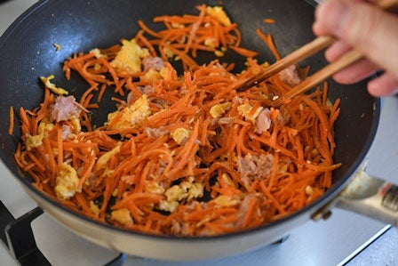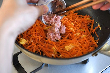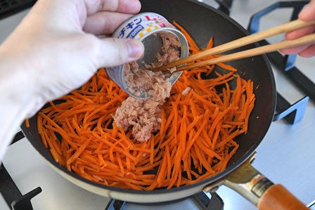 卵とにんじんを合わせた後に、ノンオイルのツナ缶をすべて加え、軽く炒め合わせて水分を飛ばします。