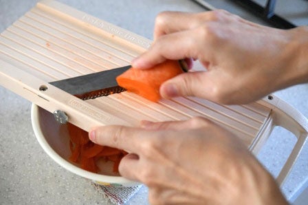 スライサーを使って、皮ごとのにんじんを4~6㎝長さのせん切りにします。