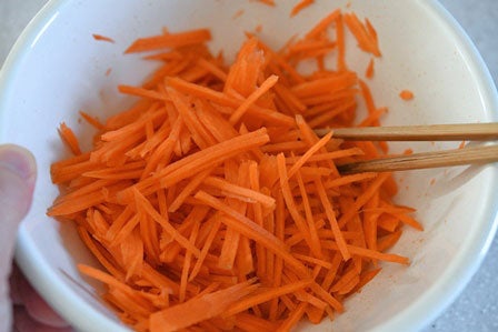 • にんじんを洗ってせん切りにする