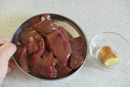 用意するものは「鶏レバーと生姜」です。生姜は主にせん切りにしますが、最後にすりおろして搾り汁を使う(可能性がある)ため、それも考慮しておいてください。