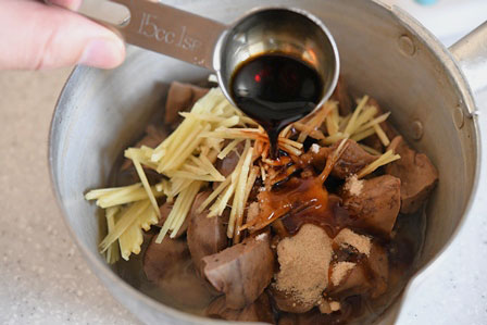 (下ゆでに使った鍋で煮るならさっと洗ってから)鍋にレバーと生姜を入れ、Aの砂糖大さじ1と1/2、水大さじ4、酒大さじ3、醤油大さじ2、みりん大さじ1と1/2)を加えます。