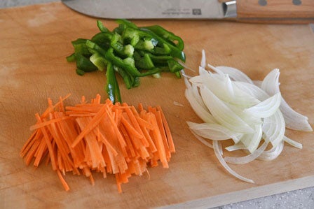 玉ねぎは薄切りに、人参は細めのせん切りに、ピーマンは半分に切って種とワタを取り除き、斜めに5~6㎜幅に切ります。