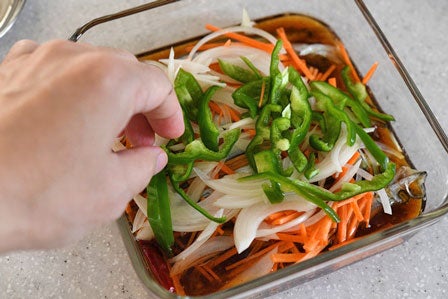 南蛮酢の中にししゃもを直に入れ、上に切った野菜を広げます。
