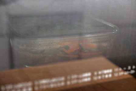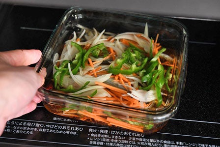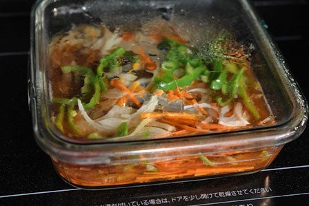 蓋をして(蓋がなければ軽くラップをして)、600Wのレンジで6分~6分半加熱します。