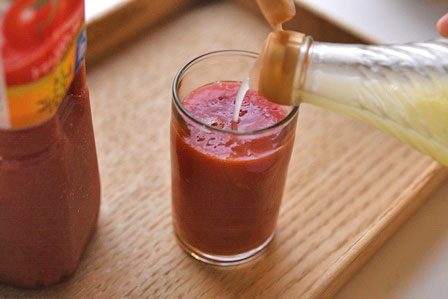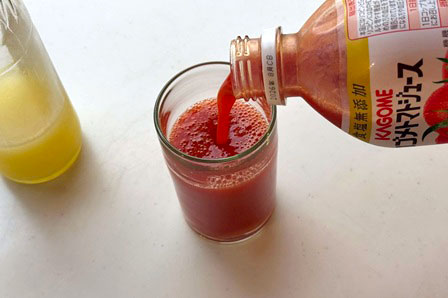 ② コップに冷えたトマトジュースを注ぎ入れ、よく混ぜます。